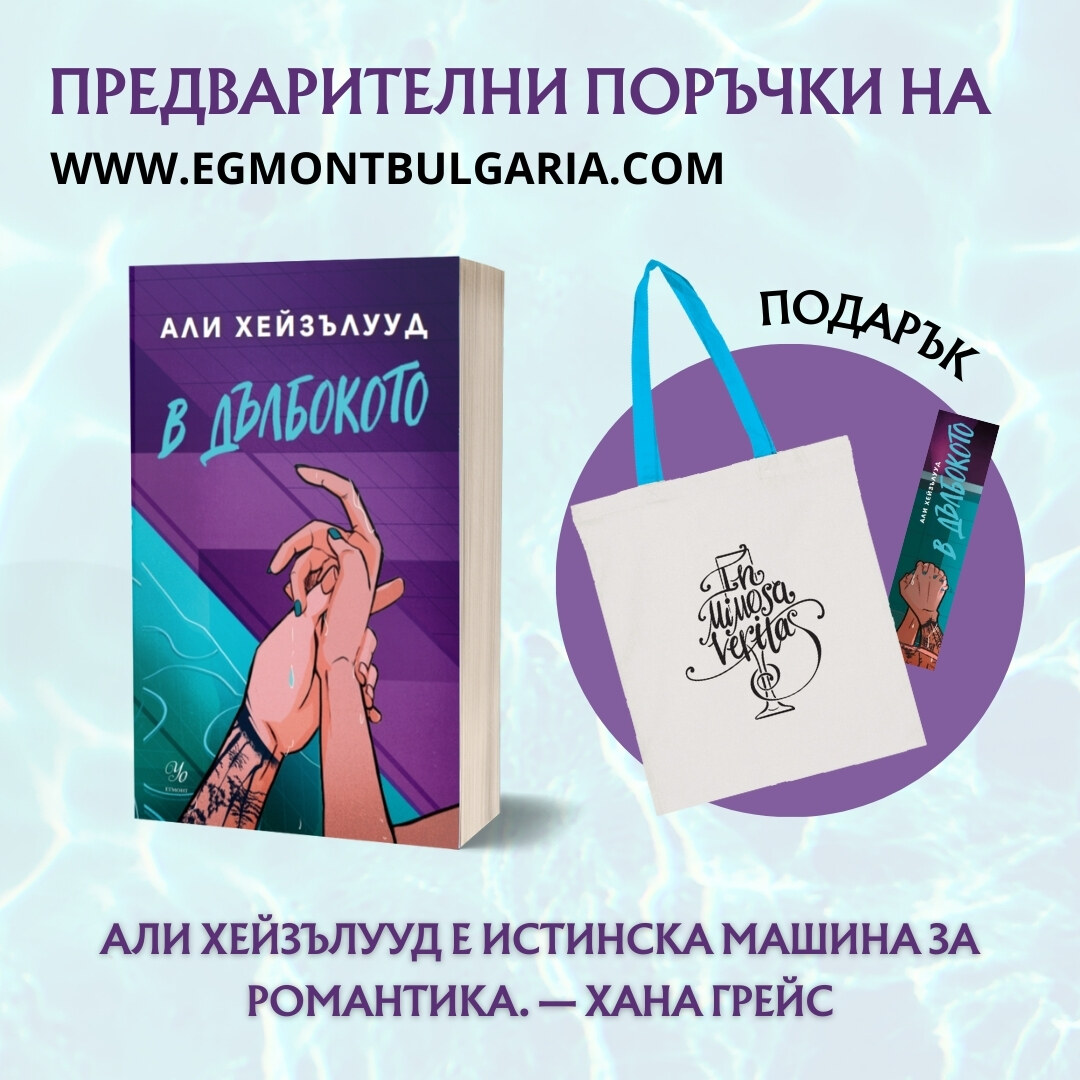 • Специално предложение. Поръчаните от уебсайта на ЕГМОНТ екземпляри от В ДЪЛБОКОТО ще бъдат придружени от ПОДАРЪК – памучна торба IN MIMOSA VERITAS и книгоразделител. Предложението е в сила до изчерпване на промоционалните количества от подаръците и единствено за уебсайта www.egmontbulgaria.com.