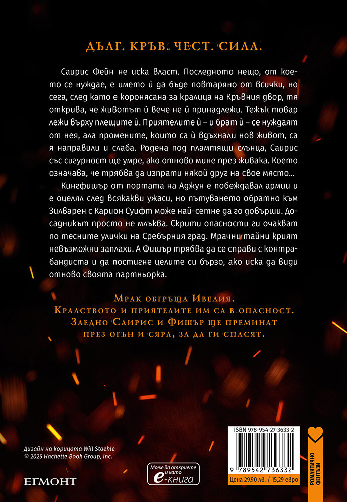 Саирис Фейн не иска власт. Последното нещо, от което се нуждае, е името ѝ да бъде повтаряно от всички, но сега, след като е коронясана за кралица на Кръвния двор, тя открива, че животът ѝ вече не ѝ принадлежи. Тежък товар лежи върху плещите ѝ. Приятелите ѝ – и брат ѝ – се нуждаят от нея, ала промените, които са ѝ вдъхнали нов живот, са я направили и слаба. Родена под пламтящи слънца, Саирис със сигурност ще умре, ако отново мине през живака. Което означава, че трябва да изпрати някой друг на свое място...