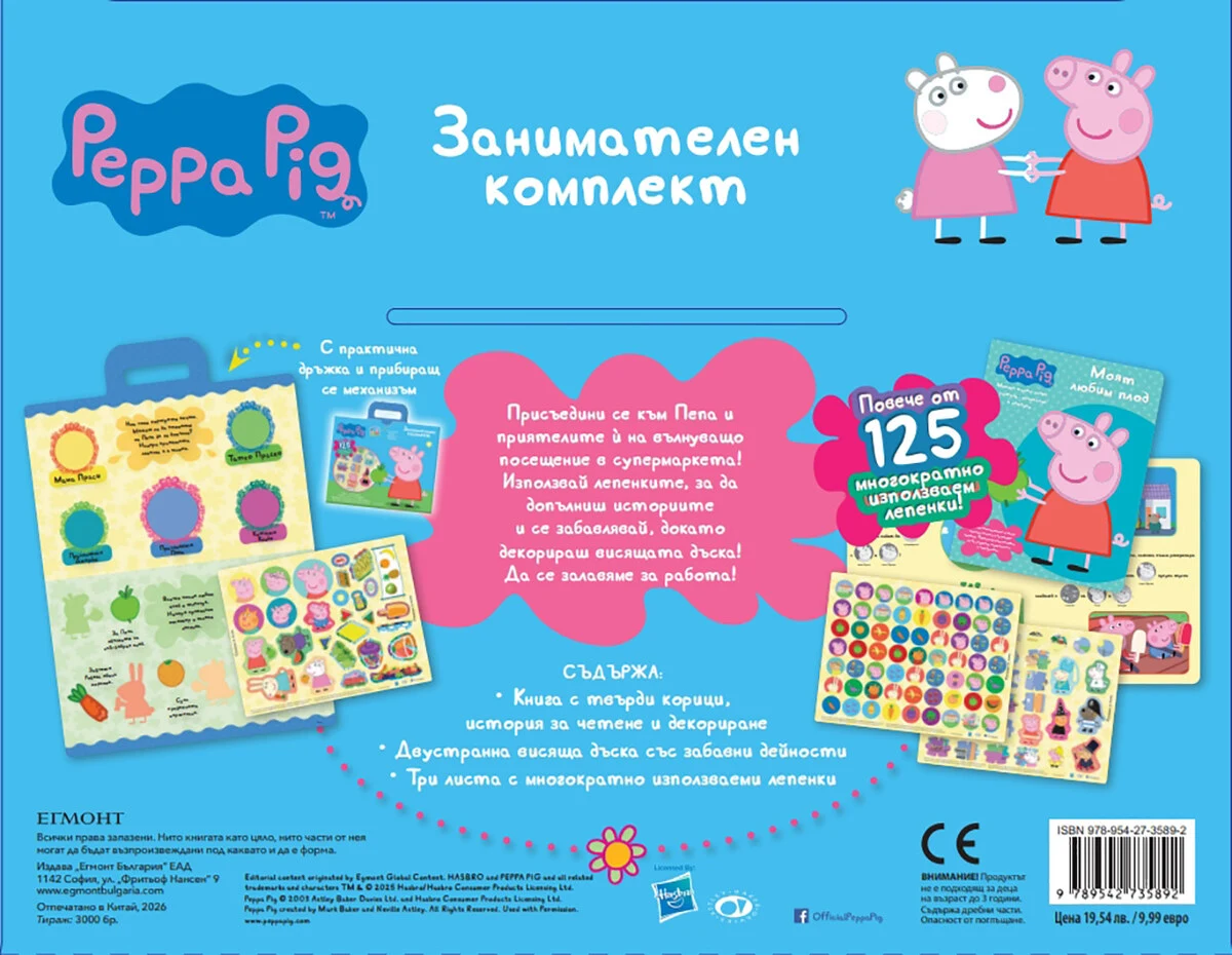 Съдържа: Книга с твърди корици, история за четене и декориране; Двустранна висяща дъска със забавни дейности; Три листа с многократно използваеми лепенки