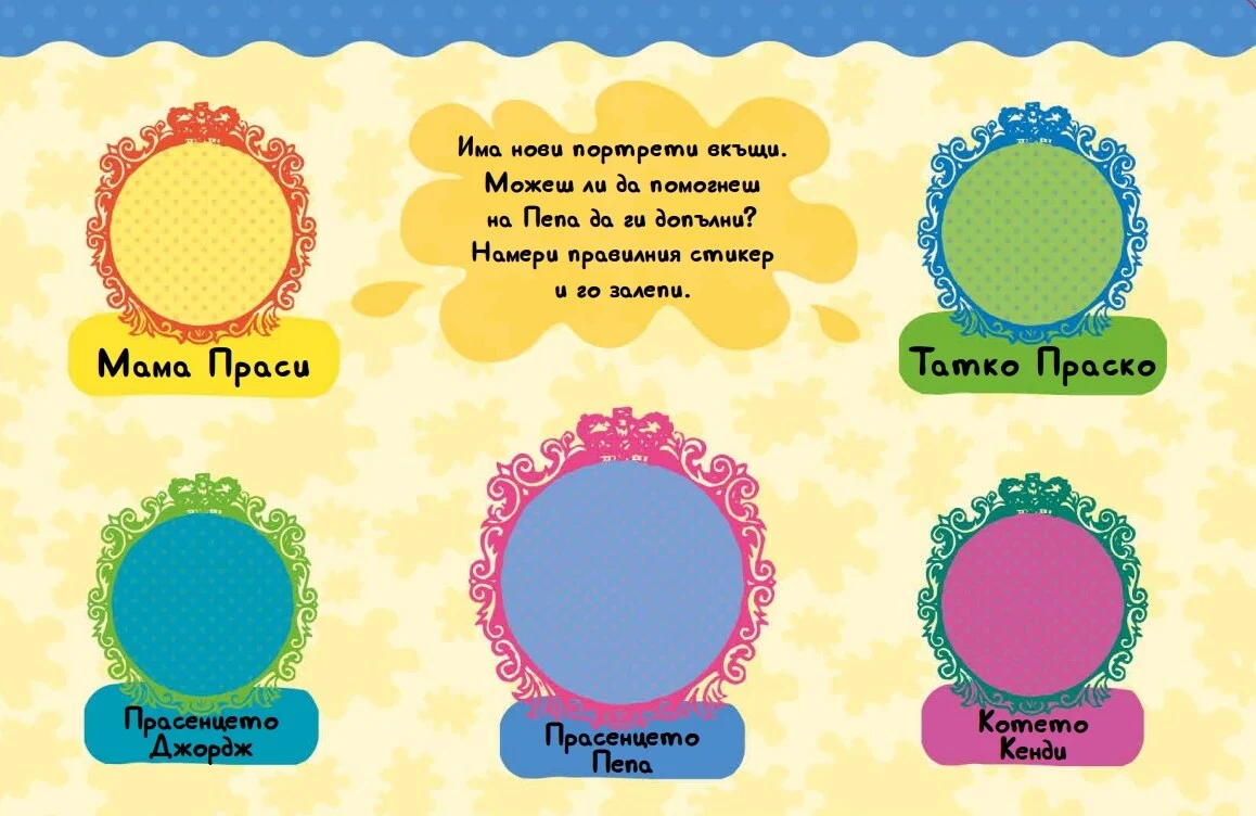 Присъедини се към Пепа и приятелите ѝ на вълнуващо посещение в супермаркета! Използвай лепенките, за да допълниш историите и се забавлявай, докато декорираш висящата дъска! Да се залавяме за работа!