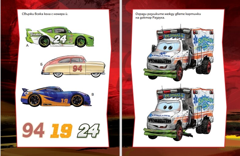 Реши задачите, които Светкавицата Маккуин, Матю и останалите приятели от Радиатор Спрингс са ти подготвили. Използвай приложения маркер, а като приключиш, просто изтрий написаното с гъбичката и започни отначало.