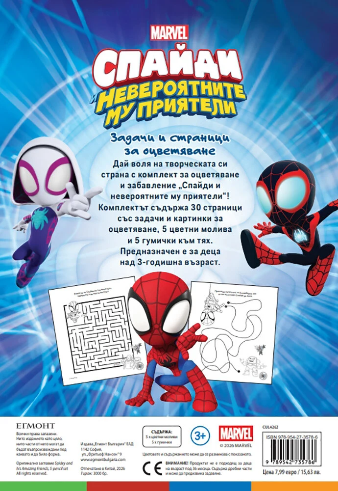 Дай воля на творческата си страна с комплект за оцветяване и забавление „Спайди и невероятните му приятели"! Комплектът съдържа 30 страници със задачи и картинки за оцветяване. 5 цветни молива и 5 гумички към тях. Предназначен е за деца над 3-годишна възраст.