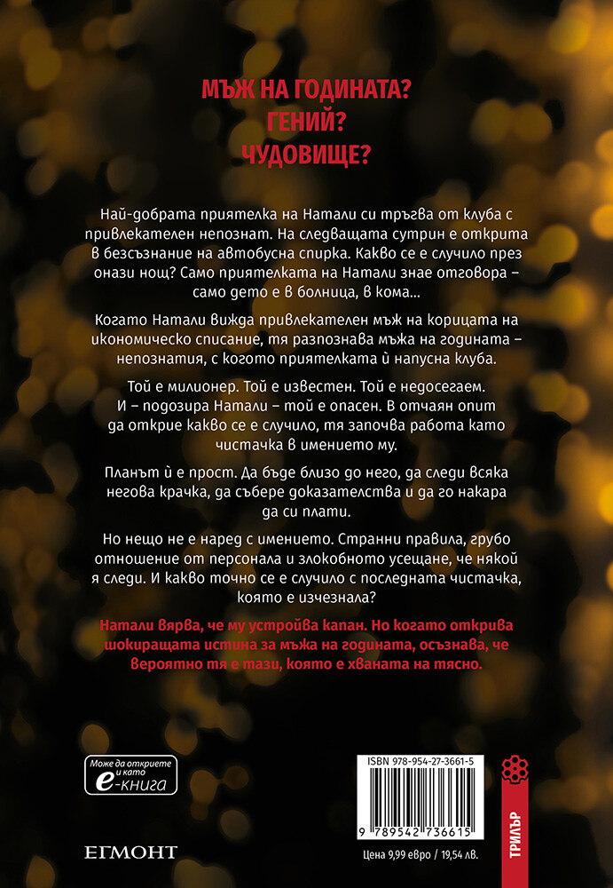 Когато Натали вижда привлекателен мъж на корицата на икономическо списание, тя разпознава мъжа на годината – непознатия, с когото приятелката ѝ напусна клуба. Той е милионер. Той е известен. Той е недосегаем. И – подозира Натали – той е опасен. В отчаян опит да открие какво се е случило, тя започва работа като чистачка в имението му.